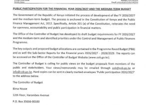 The Office of the Controller of Budget (OCOB) is an independent office established under Article 228 of the Constitution of Kenya with the core mandate being to oversee implementation of the budgets of the National and County Governments by authorizing the withdrawal from public funds. [Read More]